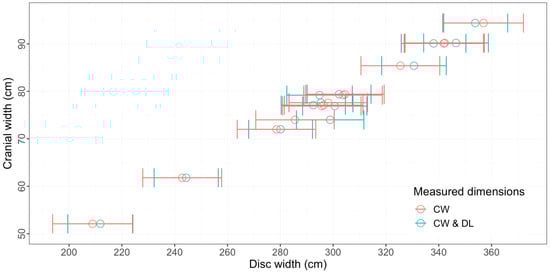 Given the strong linear relationships between the dimensions of the M. alfredi, our models allow the prediction of unmeasured dimensions from other measured dimensions. Here, we provide an example of predicting the otherwise difficult-to-measure DW for 13 different individuals using drone-based measurements of either CW alone or DL and CW from these individuals (Figure 8). The 95% confidence intervals of predicted DWs based on the CW measurements alone were wider than those of the drone-based measurements of both CW and DL, indicating that DW is most accurately predicted for a given individual using a model that incorporates measurements of both CW and DL.