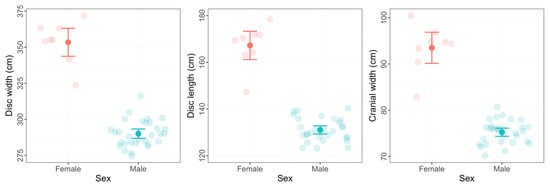 We found strong evidence of sexual dimorphism in body size of M. alfredi, with adult females larger than adult males in all three morphometric dimensions measured. This finding is similar to those in several other regions [,,,]. This is likely related to female M. alfredi requiring a larger body to gestate their large, precocial pups [,].