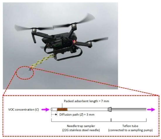 Before 2000, tethered balloons were used to collect and identify the concentrations of atmospheric pollutants. A series of balloon samplings were performed by Greenberg et al. [1] from 1985 to 1996 to collect biological volatile organic compounds (BVOCs), and to estimate BVOC emission rates from terrestrial vegetation. To provide mobility, a UAV with fixed wings was used to carry electrochemical and optical detectors of particulate matter (PM) [2]. Owing to the rapid development of multi-rotor drones and the need to identify individual organic pollutants, various samplers have been installed on drones, including adsorptive tubes [3], canisters [4,5,6], and sampling bags [7]. The take-off load of a large multi-rotor drone typically exceeds 5 kg, so various types of large sampling devices (canisters, air pumps and pipelines) can be carried in flight to take atmospheric samples. Due to its small size and easy operation, the mini drone is very suitable for sampling and identifying sources of pollutants in industrial areas. The micro sampler, NTS, meets the requirement of a mini drone in that its take-off mass is lower than 750 g.