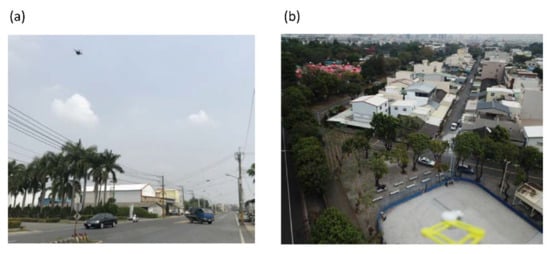 Photographs of air sampling by a drone: (a) Downwind sampling of the steel processing plant (Plant S) at Site A; (b) Flight sampling above the boundary wall of the community at Site B. The needle trap sampler on the telescopic sampling device is shown at the bottom in the picture.
