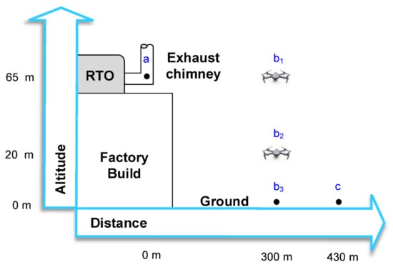 Site B is located close to the boundary of an electronic processing park in Kaohsiung City. The exhaust gas from the equipment, regenerative thermal oxidation (RTO), which is equipped to decompose thermally the organic vapors from a semiconductor processing factory (denoted as SC in Figure 2), was suspected by the residents in the adjacent communities (denoted as R in Figure 2) to be an emission source of organic solvents. The manager of the semiconductor processing factory asked our team to take gas samples using the drone with an NTS to determine its pollution emission. Figure 3b presents drone sampling above the resident community close to the semiconductor processing factory. Figure 4 shows locations of VOC samplings at Site B. Air samples were taken inside the exhaust chimney of the RTO using a Teflon bag with an air pump, following the standard procedures, NIEA A722.76B, as specified by the Environmental Protection Administration, Taiwan [18]. The air samples, which were taken by the drone, were collected in active sampling mode. Air samples were collected on the ground in passive sampling mode over sampling periods of approximately 12 h.