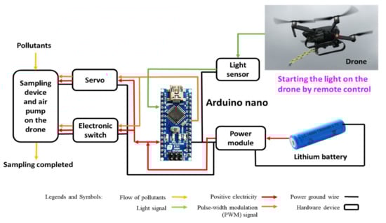 The DJI Mavic Pro quadrotor drone is small and very lightweight. It cruises and hovers at a fixed point at a desirable altitude above the industrial zone. The mini drone has a 335 mm diagonal wheelbase (excluding propellers), and a maximum horizontal voyage speed of 65 km/h. It uses a lithium battery (LiPo 3S) of 11.4 V [19]. The launching mass of the drone was 734 g [19], and the overall mass of the sampling device, including the mini air pump, Teflon tube, ABS (acrylonitrile butadiene styrene) rack, and an NTS, was not more than 200 g. The maximum flight period of the drone was limited but not exceeding 15 min. The detailed specifications of the sampling device were as presented elsewhere in an earlier work [16,17]. The operator uses a remote controller to initiate all of the VOC sampling steps one by one, as shown in Figure 5. The control program of the sampling action is written by Arduino nano via touching the light switch. The optimal location close to the drone for extracting VOCs while avoiding the downward air flows that are generated by the rotating propellers was simulated in SolidWorks [20], and the results of the simulation were evaluated by Cheng et al. [16] using a pilot experiment. The location for adsorbing VOCs by an NTS was exactly below the head of the drone, at a vertical distance of 75 mm and a horizontal distance of 173 mm from the center of the propeller. Figure 1 shows the telescopic sampling device, which extends beyond the zone of air turbulence.