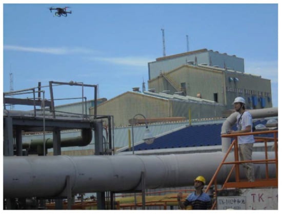 Owing to the inadequacy of currently used air monitors, several air sampling devices have been developed for transport on a drone to take air samples for the subsequent qualitative and quantitative analysis of individual organic components in the laboratory. The NTS, carried on a drone with a telescopic sampling device, that extends the NTS beyond the strong downdraft stream that is generated by the propellers of a drone, has been proved to be feasible means of taking representative air samples for VOC analysis [16,17]. A mini drone (Mavic Pro, DJI), carrying an NTS (Figure 1), is a small, unmanned air vehicle (UAV) for sampling, and it is especially suitable for collecting VOCs that are emitted around industrial areas. Two real cases of the use of a drone with an NTS to identify industrial VOC emission sources are presented herein.