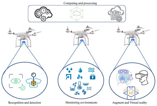 Drones can help manage various public health issues, including epidemics and dangerous illnesses such as COVID-19. During the COVID-19 pandemic, for example, certain governments and nations used drones to scan the virus’s fast spread, identify patients, and then estimate mortality risk factors using AI algorithms to the acquired data. Drones have been used to monitor crowds, transmit public announcements and information, spray disinfectants, and take thorough temperature readings in various residential environments [171]. The lifeguard community often uses UAVs for search and rescue operations that need quick action. Instead of utilizing human-crewed airplanes, which may take longer to deploy, UAVs’ adaptability quickly assesses the rescue scenario [172]. Using UAV computing, AI, and computer vision techniques to imitate visual reality might lead to new applications that allow for speedier and real-time judgments in emergencies. UAVs, for example, identify impediments by flying over them, collecting data, extracting the essential aspects, and making choices using machine vision and pattern recognition technology. People with vision impairments can navigate more quickly in this manner. This technology is anticipated to be a critical component of the healthcare revolution [172].