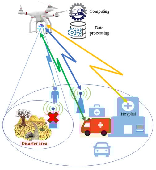 Aerial access networks are crucial enablers for future (e.g., B5G) wireless systems [6,7]. Aerial access networks comprise various platforms with a varying range of coverage, including low-altitude platforms, high-altitude platforms, and satellite communications. Furthermore, various characteristics of aerial access networks distinguish them, such as ubiquity, mobility, availability, simultaneity, and scalability [6]. These fundamentals will support the complete range of traditional terrestrial communications and enhance communication services and customer delight. Unmanned Aerial Vehicles (UAVs) are used as Access Points (APs) and radio towers at the low-altitude tier of supporting B5G aerial access networks, providing wireless and computing services to ground users from the air when the terrestrial communication network is unavailable [8]. UAVs can establish wireless networks as mobile Base Stations (BSs) in a short amount of time. In addition, UAVs can fly about to adjust their positions to provide Line-of-Sight (LoS) connectivity to the ground nodes, which can greatly enhance network performance compared with terrestrial communications. Furthermore, UAVs can be swiftly deployed to provide wireless communications in remote places with complicated conditions, such as disaster areas and emergency events [9,10], because of their flexibility and mobility. Moreover, UAVs with computer servers provide a new MEC paradigm. Therefore, UAVs have received much attention from the business world and researchers. However, critical technological hurdles in UAV computing, e.g., limited operating times, are yet to be overcome, and it is in the early stage.