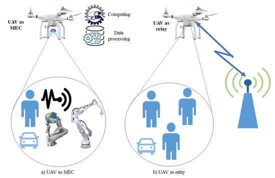 Figure 3a illustrates the importance of using UAVs as MEC servers on the board and flying to help everything, including users, sensors, robots, etc. The computing task is performed in a UAV with the help of intelligent techniques. Furthermore, the UAV serves as a central relay, as shown in Figure 3b. It is shown that the UAV is aiding the mobile users in offloading their computational responsibilities to a particular MEC server.