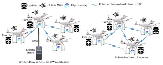 Recently, Federated Learning (FL), a decentralized ML approach [25,26], has been proposed to solve similar difficulties in which each participating user learns a model based on its local dataset. The local model modifications are then communicated to a parameter server so that a shared global model may be updated. Thus, the UAVs are fed the revised global model for the next round of local training. Local model changes are communicated back to the server in FL instead of the traditional case of sending back the training datasets to the cloud. As a result, training models may be shared while maintaining anonymity, and communication costs can be lowered. Because of these compelling benefits, researchers are increasingly focused on using FL in wireless communications [27,28,29,30,31]. FL was used in resource-constrained MEC [30], while it was also used in IoT applications [28]. Kang et al. [27] discussed a reputation-based worker selection approach for boosting FL’s performance, using advanced blockchain-assisted techniques for secure reputation management. It was also used to solve intercell interference and scheduling issues in wireless networks [31]. Furthermore, the performance could be achieved when the signal to interference plus noise ratio was high enough. In the Ultra-Reliable Low-Latency Communication (URLLC) of vehicle networks, Samarakoon et al. [29] introduced FL for solving a combined resource allocation and power issue, proving that vehicular users’ power consumption may be beneficially lowered.