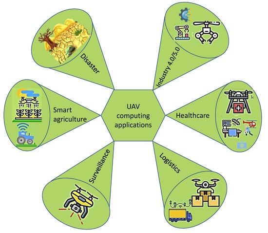 UAVs have recently gained a lot of interest in various applications, including delivery, agriculture, emergency response, communication services [77], and mars exploration [154]. The authors of [33] evaluated UAV mobile edge computing for upcoming IoT applications and the role of ML and DL in overcoming latency, job offloading, energy demand, and security constraints. Below, we provide a range of application domains where UAV edge computing could be used, as also shown in Figure 6.