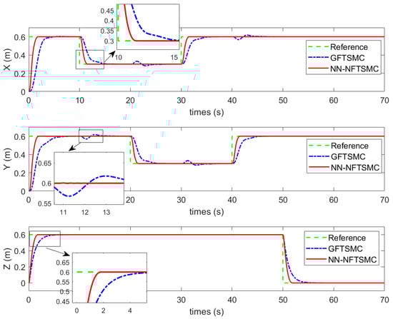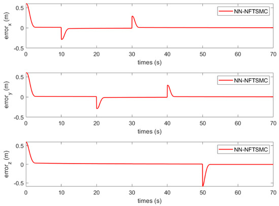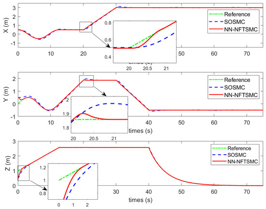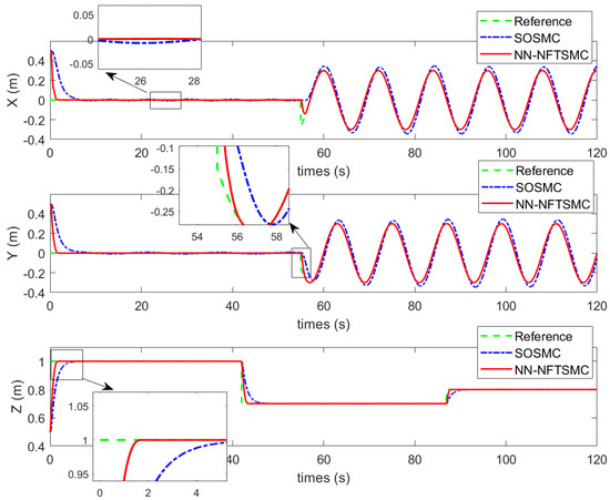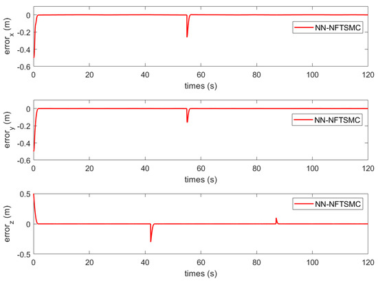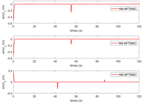 The trajectory tracking performances under the model uncertainties and time-varying disturbances are presented in Figure 11 and Figure 12. It can be seen that the proposed NN-NFTSMC method achieves the desired trajectory tracking with a faster convergence rate than that of the SOSMC method. The trajectory tracking using the NN-NFTSMC approach has much lower oscillations and overshoots. However, the SOSMC approach can hardly handle the chattering well, which is aggravated by parameter uncertainties and disturbances. Figure 13 shows the time histories of the position tracking errors with the NN-NFTSMC. The position tracking errors converge to the neighborhood of zero in finite time. During the steady state, the error accuracy of the position is on the order of .Based on above analysis, it is clear that the proposed method can provide better tracking accuracy and faster convergence rate.