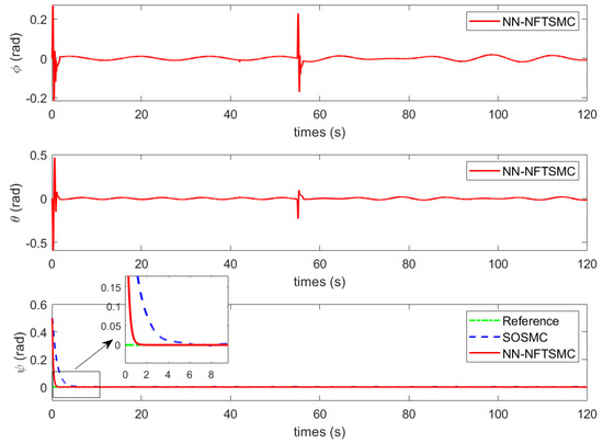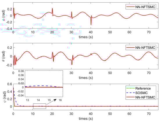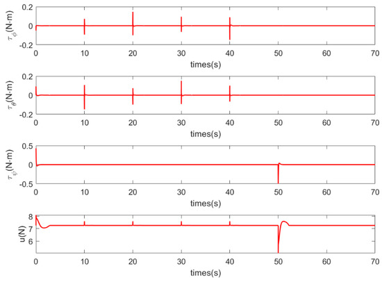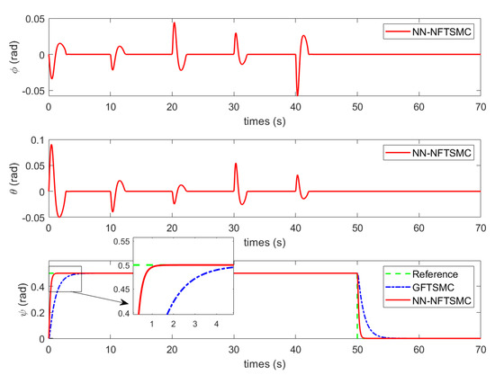The trajectory tracking results of both methods are shown in Figure 4 and Figure 5, and the tracking errors of the proposed method is displayed in Figure 6. It can be seen that both the NN-NFTSMC and GFTSMC methods are able to hold the quadrotor position and attitude steady, even though the desired position and angle are modified in every moment. However, it is obvious that the GFTSMC technique is unable to maintain the null steady error due to the coupling relationship between these state variables. The designed NN-NFTSMC controller is able to maintain the system state variables on their references without oscillation. In addition, compared with the GFTSMC technique, NN-NFTSMC can provide more rapid response speed and take less time to drive the state errors to zero. The control inputs are displayed in Figure 7, which include the total thrust u, rotation torques , and . These results fully prove that the proposed NN-NFTSMC controller has advantages over the GFTSMC controller in terms of suppressing coupling, tracking accuracy and convergence rate.