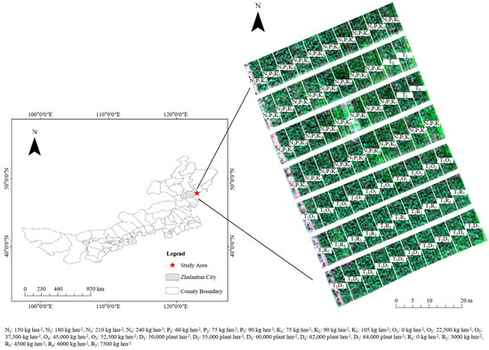 The eastern part of the Inner Mongolia Autonomous Region is an important black soil area in China and an important area for maize production. Our experiment was conducted in 2022 at Dahewan Farm (123°1′33″ E, 47°54′2″ N) in Zalantun city. The area belongs to the temperate semi-humid continental monsoon climate zone with fertile soil and sufficient sunshine. The maize cultivar “Huaqing 6” was used in the experiment with different field treatment trials, including different amounts of inorganic fertilizer, organic fertilizer, and straw returned to the field, and different planting densities (Figure 1). The inorganic fertilizer treatment included four nitrogen application levels (N1: 150 kg hm−2, N2: 180 kg hm−2, N3: 210 kg hm−2, and N4: 240 kg hm−2), three phosphate (P2O5) application levels (P1: 60 kg hm−2, P2: 75 kg hm−2, and P3: 90 kg hm−2) and three potash (K2O) fertilizer levels (K1: 75 kg hm−2, K2: 90 kg hm−2, and K3: 105 kg hm−2); the organic fertilizer treatment had five levels (O1: 0 kg hm−2, O2: 22,500 kg hm−2, O3: 37,500 kg hm−2, O4: 45,000 kg hm−2, and O5: 52,500 kg hm−2); the treatment with straw returned to the field had five levels (R1: 0 kg hm−2, R2: 3000 kg hm−2, R3: 4500 kg hm−2, R4: 6000 kg hm−2 and R5: 7500 kg hm−2); and the treatment with varying planting density had five levels (D1: 50,000 plants hm−2, D2: 55,000 plants hm−2, D3: 60,000 plants hm−2, D4: 62,000 plants hm−2, and D5: 64,000 plants hm−2). All treatments were performed with two replications. In addition, two zero-fertilizer plots (T0: 0 kg hm−2) and two plots with a stable compound fertilizer (T1: 750 kg hm−2 of stable compound fertilizer with an N-P2O5-K2O ratio of 26-10-12) were also included in the experiment. The organic fertilizer, straw returned to the field, and varying planting density treatments received a stable compound fertilizer at an N-P2O5-K2O ratio of 26-10-12 at 750 kg hm−2. The plot size is about 30 m2. Except for the differences in treatments mentioned above, all other field management measures were the same.