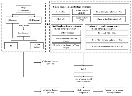 To analyze the effects of different modeling strategies on LAI prediction, this study included different scenarios based on RGB and MS image use. For each scenario, stepwise multiple linear regression (SMLR) was used to create the LAI prediction model. The results were compared and analyzed to show the advantages and disadvantages of each modeling strategy. The details of modeling are shown in Figure 3.