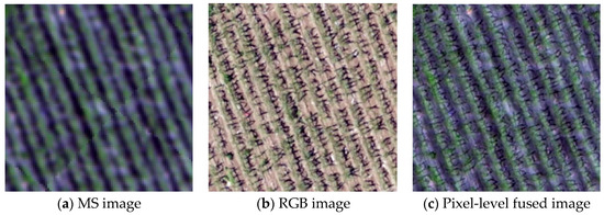 Notably, the pixel-level fused image was obtained by the fusion method proposed by Selva et al. [28]. According to their study, the acquired RGB and MS images were fused according to Equations (1)–(5).
