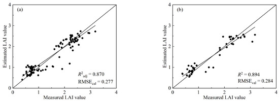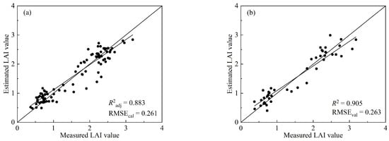 Results obtained from the model created with the SI and textural features of pixel-level fused images to predict LAI. (a) Calibration; (b) validation.