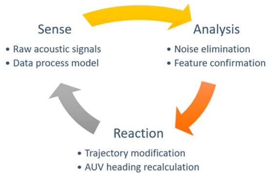 During the first segment of the loop, Sense, an AUV will acquire information about its surroundings via taking raw acoustic measurements using, in our case, a payload sonar sensor, the output of which is analyzed through a data process model. The obtained data undergo a series of analysis processes during the Analysis stage to identify sensed features in the water and to confirm the presence of a desired target. Since almost all of the sensor measurements include noise and different types of errors, typically they are eliminated or filtered prior to the analysis process. The final segment is Reaction. In this stage, the specification of the originally given trajectory will be modified, and new AUV headings will be calculated in accordance with the freshly generated course and trajectory.