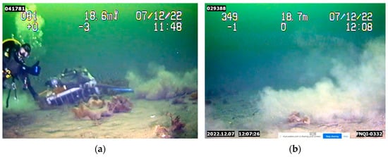 Installation of Nikuni’s micro-sized bubble generator. (a) The diver from the Marine Institute gives the Okay sign after adjusting the valve at the end of the pipe. (b) The generated bubble plume.