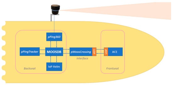 International Submarine Engineering (ISE), the AUV manufacturer, integrated an independent control computer on Memorial University’s Explorer AUV during a major vehicle upgrade in 2019. There are several available frameworks for an adaptive mission system that were specifically designed for underwater vehicles [24]. Examples include MOOS-IvP [35], ROS [36], T-REX [37], ORCA [38], and so on. Among those options, the Mission-Oriented Operating Suite (MOOS-IvP) software was implemented in our system. The pMoosCrossing application allowed bidirectional data transfer between the frontseat (ACE) and the backseat (MOOS) through the UDP protocol as shown in Figure 4. Therefore, data from various sensors on the Explorer (e.g., depth sensor, velocity sensor, altimeter, and GPS) along with data from the payload sensor (Ping360) were regularly updated to the MOOSDB so that IvP-Helm could make decisions on the desired vehicle state in the following control cycle.