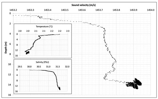 To ensure the precision of our system, we continuously update salinity, temperature, and depth information in real time, operating at a frequency of 1 Hz. The calculated salinity at the depth of operation is then incorporated into the sound speed formula, allowing us to accurately determine the speed of sound in the underwater environment. Figure 5 shows the sound velocity profile calculated using Equation (1). Insets show the temperature and salinity collected in the ocean in Holyrood Bay as independent variables.