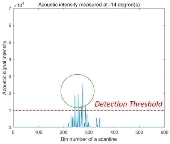When a pulse of sound is emitted from the Ping360, a straight acoustic beam travels through dark (as in uncharted) water in a wave pattern at 750 kHz frequency. Similar to someone shining a flashlight in a dark room and only the space where the flashlight’s beam is reflected becoming visible, an acoustic beam (hereinafter referred to as a ‘scanline’ in this paper) illuminates the space where the oscillating wave has passed through water [44]. A reflected pulse is displayed as an individual line depicting the cross-section of an object or a surface. When there is a target located within the set range, an echo bounced off the object is displayed as a stronger acoustic signal than the ambient noise level within a scanline (see Figure 6).