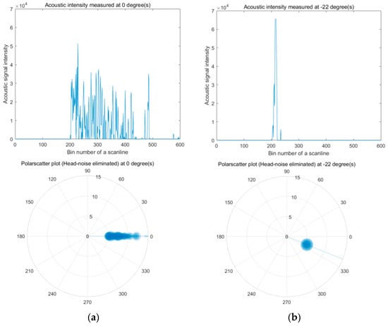 The Ping360 is an active sonar, which sends a ping (a pulse of sound) and receives a reflected wave (echo) in order to detect objects. While operating, the Ping360 also generates strong noise around the sonar head presumably emanating from the transducer during its rotational motion [27]. Unlike possible ambient noises, this noise is persistent, and the thickness of the surrounding noise band is approximately 0.25 m. This means that the analysis algorithm would not be able to distinguish an object within this band. In other words, valid detection can be made only in the range outside of this proximate region. In order to eliminate unnecessary confusion in the later analysis process and keep the total data size as low as possible, any measurements obtained in this proximate region (0–0.25 m sonar range) were excluded.