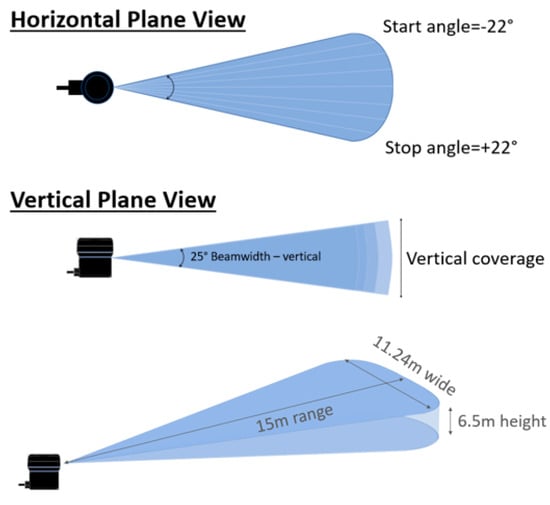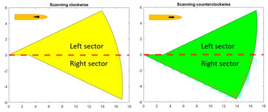 The Ping360 is a “3D scanning sonar” with a mechanically rotating transducer inside the sonar head. This rotating action causes a delay between each beam of the scan of up to 35 s. For example, if the sonar completes the full scan (360°) with an incremental angle of 1° while the vehicle keeps moving forward at its cruise speed (1.5 m/s), the complete scanned coverage is not a circle, but rather an oblong shape. This distortion of the sonar coverage can be minimized when the sonar is set to scan the forward section from the vehicle only (see Figure 18). The sensing coverage and the time delay are traded off against each other. Hence, to minimize the delayed time and to maximize the areal coverage, it is crucial to find the most optimal setup: incremental angle (1° or 2°), sonar range (20–50 m), and total scanning azimuth (fan-shape or full scan).