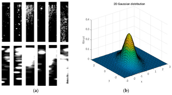 Second, a lot of small gaps between tiny bubbles result in sporadic signals. Then, those low signals that did not pass the DT (undetected) were excluded in the processed data. They all inevitably lead to noise-like and patchy profiles (see Figure 9). Since the scattered data are difficult group, we adopted a Gaussian blur (also known as Gaussian smoothing) method to reduce the noise. Gaussian smoothing is a type of convolution operator using a mathematical model [50] called a “2D isotropic Gaussian function” as shown in Equation (3),