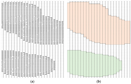 The Gaussian blurred image can be expressed as convolution kernels as shown in Figure 10a. The kernels that touch or share their edges become connected and the adjoined kernels are considered as a part of the same object if they are horizontal, vertical, or in a diagonal direction as shown in Figure 10b. Once each patch is grouped together, each clustered patch is labeled. Although the actual values in the kernel are multilevel (i.e., non-binary), all non-zero values are treated equally when being labeled.