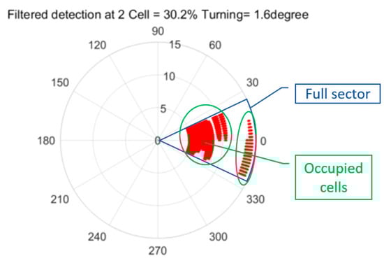 The fundamental assumption of occupancy grid mapping is that the environment map is constructed, as the vehicle pose is known and the location of the detected object is static. As we disregard the density of our target (plume) in our paper and the plume is considered to be dynamically dispersing (non-static), the acquired information of the map is only taken into account as a temporal view of the world. So, the total percentage of the occupied cells within the cone-shaped binary kernels is the key criterion to determine the next desired pose of the vehicle (see Figure 11). The occupied cells in red represent the detected plume within the fully scanned sector.