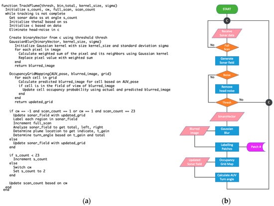 (a) Pseudocode of the system algorithm; (b) Plume tracking algorithm loop diagram.