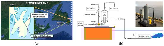 (a) Marine base in Holyrood, NL, Canada for the AUV field trials; (b) Configuration of the microbubble-generating system. The plume size is not to scale.