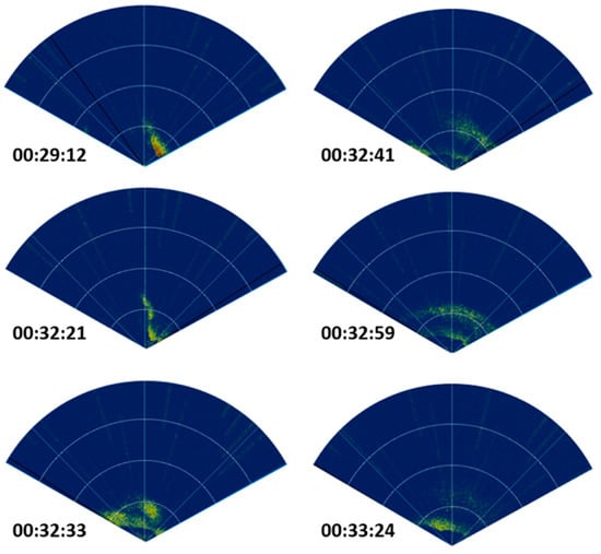 The primary objective of this field trial was to confirm the function and operation of the module, pPlumeTracker, developed based on the proposed detection method. While conducting consecutive line-following missions, the Ping360 continued to capture the micro-sized bubble plume for about 270 s (4.5 min) as shown in Figure 14. Each full scan took approximately 12 s to complete each fan-shaped sonar screen.