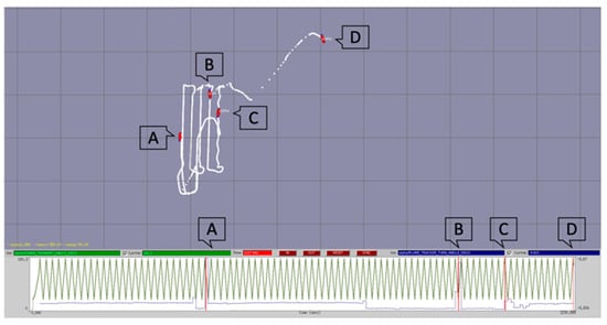 The AUV trajectory recorded in the local frame of reference (local Cartesian coordinates) by the backseat driver is plotted in Figure 15. The approximate location of the plume relative to the AUV path is presented (not to scale). There were two significant (high peaks: marked as A and B) and one suspected (low peak: marked as C) moments where the microbubble plume appeared on the sonar screen and was confirmed by the pPlumeTracker module. The pPlumeTracker module response during the mission is shown in Figure 16. The total detection result (one of the main outcomes from pPlumeTracker) indicated that the highest detection was 2669 while the background average was about 1515. We only generated the turning commands within the local module instead of parsing them as the real vehicle driving commands to the backseat drive system, for the sake of the vehicle safety at this stage. Hence, these presented commands were all virtual. The virtual turning command from the pPlumeTracker module remained between −9.5° and −10.0° (see Figure 16), which was not ideal since it would lead to a continuous turning. Considering the turning angle ranges being between −10.0° and +10.0°, the result revealed that the set background threshold was too high, which impacted the turning commands in a way that the vehicle was (virtually) directed to turn to the port side. Therefore, the guiding threshold to determine the presence of the plume was re-set to the average (1515). Also, the maximum turning angles were increased to the range between −20.0° and +20.0°. After those coefficients were tuned, the data were replotted as shown in Figure 17. The tuning process produced a more optimized command result.