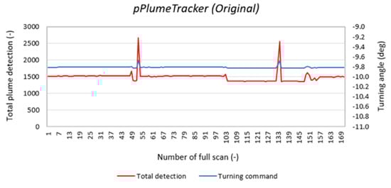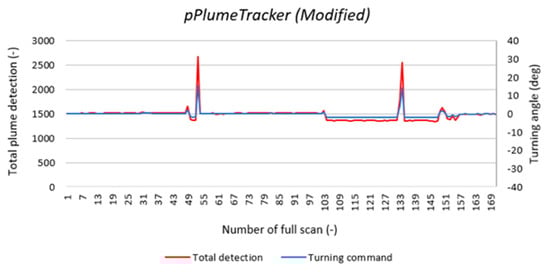 The modified pPlumeTracker module response after tuning two variables: detection threshold and turning angles (±40°).