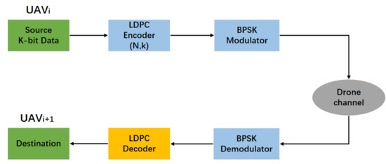 The large amount of collected power data needs to be efficiently and reliably transmitted between the drone and the drone relay, or between the drone relay executing inspection tasks. Therefore, the drone channel adopts LDPC channel encoding and decoding to improve the anti-interference ability of the drone data link. The drone data link transmission model based on LDPC code is shown in Figure 2. () serves as the transmitter, taking captured images, videos, and other power data as input. The input data are channel encoded using LDPC code. Then, BPSK digital modulation is used to map the binary data into constellation symbols, which are transmitted through the communication channel between unmanned aerial vehicles (i.e., the small-scale fading Rician channel of the air-to-air link). serves as the receiver, performing the opposite operation on the drone relay compared to the transmitter, namely, digital demodulation, LDPC decoding, and outputting data.