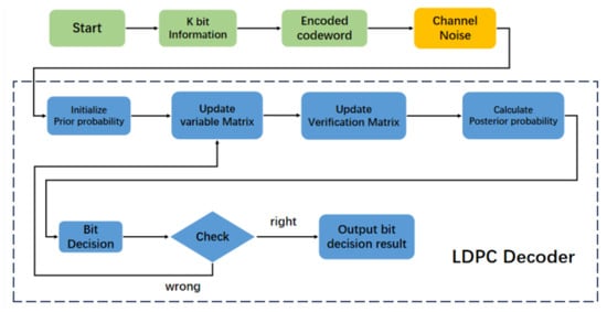 LDPC codes (N,k) consist of k information bits and (N–k) parity bits. They offer advantages such as low decoding complexity and parallel decoding capability while approaching the Shannon limit. It is suitable for application to unmanned aerial vehicle communication. The parity-check matrix of LDPC [38] exhibits strong sparsity, containing only a few non-zero elements. The information is encoded using an LDPC encoder [39] to obtain codewords, denoted as y = x · G, where G is the generation matrix. When codewords pass through the channel, they are affected by noise. The decoder takes the maximum likelihood ratio of the signal affected by noise as its input. Through the continuous updating of the check matrix and variable matrix, that is, the iterative process of variable nodes (VNs) and check nodes (CNs) constantly updating and transmitting messages to each other, the LDPC iterative decoding algorithm realizes the channel decoding process. The flow of the LDPC iterative decoding algorithm is shown in Figure 3.