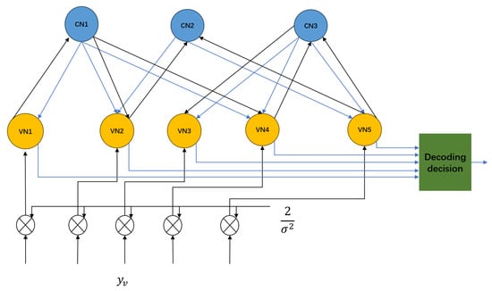 The main idea of the NMS algorithm is to adjust the calculation result by multiplying it with a correction factor during the step of updating the verification node information in the MS algorithm. The LDPC parity-check matrix H can be visually represented using a Tanner graph, where variable nodes (VNs) represent the bits in the codeword, and check nodes (CNs) represent the parity-check equations. In the LDPC parity-check matrix, H(i, j) = 1 indicates that the ith variable node (VN) is connected to the jth check node (CN) in the Tanner graph, while H(i, j) = 0 indicates no connection [40]. The LDPC decoding framework, as shown in Figure 4, is a bidirectional graph composed of check nodes, variable nodes, and the edges connecting them. The implementation of the NMS decoding process is represented on the Tanner diagram as iteratively updating and passing messages between VNs and CNs.