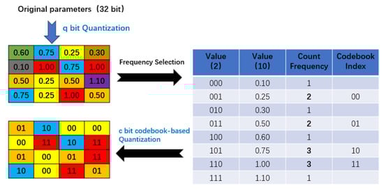 First round of quantization: Quantifying the decimal places of 32-bit floating-point parameters to q bits. Second round of quantization: Designing a weight quantization method based on a codebook. When the size of the codebook is c bits, we calculate the frequency of occurrence of each type of weight from the types of weights, and select the most frequently used weights from large to small as the codebook values. Then, the weights are quantized to the nearest value in the codebook, further reducing the number of weight types in the neural network and, thus, reducing computational complexity. An example of the quantization process (q = 2, c = 2) is illustrated in Figure 5.