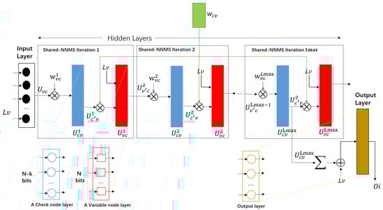 Considering that the NMS algorithm reduces complexity at the cost of performance degradation, there is a need to enhance its performance while maintaining a relatively unchanged computational complexity in order to better apply it to the long-code decoding application of large amounts of drone data. Due to the successful combination of deep learning (DL) with many physical layer communication algorithms [41], the NMS algorithm is combined with DL techniques. DL can be divided into two methods: the data-driven methods and the model-driven methods. On the one hand, the data-driven methods require a large amount of training data to improve performance at the cost of significant latency and significant resource consumption. On the other hand, the model-driven methods combine communication knowledge with deep learning, based on prior knowledge of specific models and decoding algorithms, making neural networks interpretable to a certain extent, reducing the need for a large amount of training data, computational overhead, and training time [42]. Therefore, the NMS algorithm is expanded into a deep feed-forward neural network based on the Tanner graph structure, and the neural-network-normalized minimum sum (NNMS) decoding network based on the NMS decoding algorithm and model-driven deep learning network is obtained. The NNMS decoding algorithm can meet the high reliability requirements of drone communication.