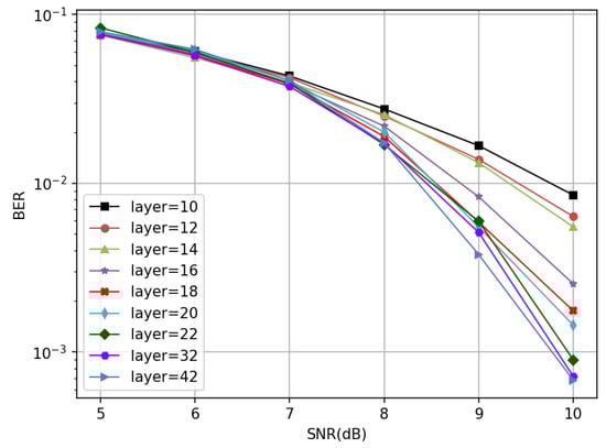 As shown in Figure 7, with the increase in the number of layers, the BER performance improves. The improvement in the decoding performance comes at the cost of increased computational complexity. Deeper network layers require more resources for additional multiplication and other operations. Therefore, while ensuring excellent BER performance, a reasonable number of network layers should be chosen to implement the decoding process.