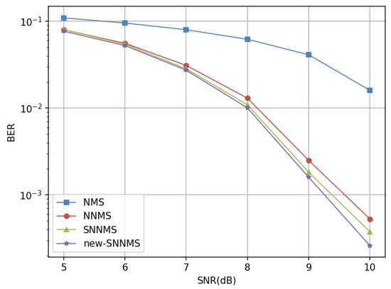 As shown in Figure 9, it can be observed that the BER performance of the new shared-parameter NNMS algorithm outperforms the SNNMS, NNMS, and NMS algorithms. In the case of the 22-layer neural network (i.e., 10 iterations) with a BER of , the BER performance of new-SNNMS performs up to 0.3 dB better compared with the SNNMS.