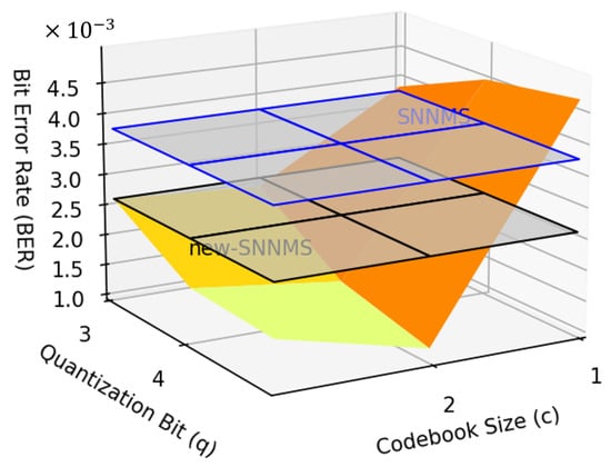 Based on the BER performance and storage space considerations, different quantization bits and codebook sizes are chosen. As shown in Figure 10, when the size of the codebook is c = 1, the BER performance deteriorates as the number of quantization bits increases. When the codebook size c is greater than 2, the greater the number of quantization bits, the better the BER performance. Furthermore, it can be seen that using the quantization scheme described in this article to quantify the weights of the NNMS decoding network, its BER performance may be even better than that of the unquantized BER performance.
