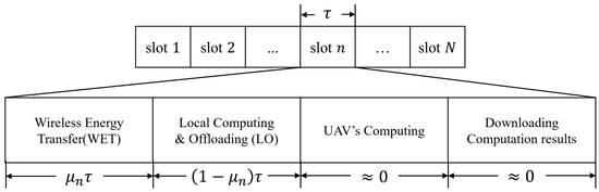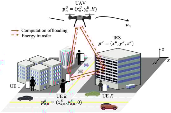 A few recent research works on UAV-assisted WP-MEC systems have begun to be conducted, where the UAV is equipped with energy and computing resources in 3D space. A UAV-enabled WP-MEC system was proposed where the MEC server was implemented on the UAV and the energy signals were used to charge the ground users’s batteries [14]. Resource allocation was investigated under the partial computation offloading mode to maximize the weighted sum computation bits by jointly optimizing the transmit power, computing frequencies, time, and UAV trajectory [14]. UAVs with an energy transmitter and a computing server were introduced into WP-MEC systems, wherein the sensor devices executed tasks using the UAV [15]. The problem formulation was also developed to minimize the energy consumption of the UAV by jointly optimizing the offloading amount, CPU frequencies, transmit power, and UAV trajectory. The WP-MEC system was previously designed to minimize the total energy consumption of the UAV that provided the users with energy supply and computation offloading by optimizing the UAV trajectory [16]. UAV-assisted WP-MEC systems can improve the computation capability of UE, thereby enhancing the energy and task offloading efficiencies.