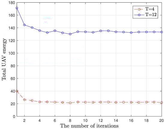 First, the convergence of the proposed algorithms is numerically investigated. Figure 3 shows the total energy consumption of the UAV versus the number of iterations obtained by Algorithm 2 with different mission time T, where the number of RIS elements is . Here, the iterations of the proposed algorithm are the outer iterations of Algorithm 2. The proposed algorithm converges quickly in terms of the total energy consumption of the UAV at about 10–14 steps. Moreover, it is observed that the number of iterations required to converge increases with the number of optimized variables, e.g., by considering a large number of slots with a large T.