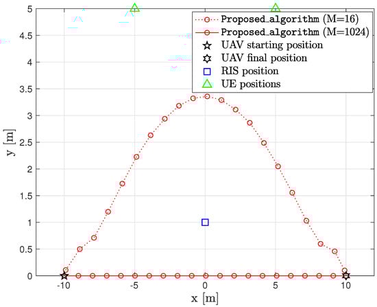 Figure 4 shows the optimal trajectories of a UAV designed using the proposed algorithm. In Figure 4, the UAV gets closer to the location between the UE and RIS to mitigate the path loss between the UAV and UE, as well as that between the UAV and the RIS. This is because the performances in terms of the harvested energy at the UE in the WET phase and the achievable rate of the UE are inversely and exponentially proportional to the interdistances from the UAV to the UE and to the RIS. However, in the case of a large number of RIS elements, i.e., , as the path loss of the UE–RIS–UAV link can be sufficiently compensated by the optimized RIS phase shift , the optimal UAV’s trajectory can be identical to the benchmark scheme with no optimization of the UAV’s trajectory (No_tra_opt).