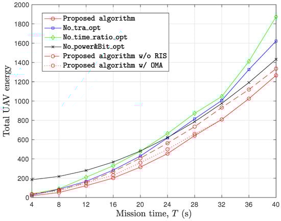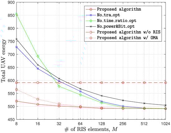 The impact of the mission time T on the total energy consumption of the UAV is shown in Figure 5, with the number of RIS elements . It is noticed that the proposed algorithm always outperforms the other benchmark schemes. In addition, the performance of either No_tra_opt or No_time_ratio_opt is similar to that of the proposed algorithm at a low mission time T. This is because the improvement in performance obtained by optimizing either the UAV’s trajectory or time ratio becomes small due to stringent constraints at a low mission time T. In contrast, the energy consumption of the UAV for the benchmark scheme without the optimization of transmit power and bit allocation (No_pow&bit_alloc_opt) approaches that of the proposed algorithm as the mission time T increases. Thus, the significance of the optimal resource allocation is emphasized when the resource for communication and computing, i.e., mission time T, is insufficient. Moreover, as a less-achievable rate for transferring the offloaded data per time slot is required for ensuring sufficient mission time, the performance gain of RSMA decreases compared with that of OMA as the mission time T increases. Oppositely, the performance gap between the cases with and without the RIS exists despite the joint optimization of the energy consumption of the UAV. This can be explained by the reduction in the channel gain resulting from the no-virtual-RIS link in the case without the RIS, which drastically reduced the achievable rate and amount of energy harvested at the UE.