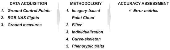 Still, methodologies to fully exploit the potential of UAS-collected data in agriculture are urgently required. In this paper, we present a novel pipeline to automatically and accurately characterize several structural component phenotypic traits in maize trails. To the best of our knowledge, the skeletonization of maize from UAS imagery-based point clouds has not been performed before. RGB images using UAS is the input of the proposed workflow to acquire a georeferenced dense point cloud of the entire study field using SfM. Topological and deep learning-based algorithms were combined to extract individual plants from the point cloud. Once a surface reconstruction process from each individual plant was achieved, the skeleton extraction algorithm was applied. Finally, we were easily able to compute structural component traits highly demanded in phenotypic tasks, comparing them with on-field and digital measurements. The paper is structured as follows: after this brief introduction, the materials, including experimental setup, data acquisition and proposed methodology are described in detail. Next, the experimental results are described, validated and discussed. Finally, the more important conclusions reached with this study are addressed, along with future perspectives.