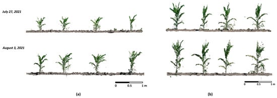 Point cloud sample processed with the imagery dataset from two flights performed (27 July and 3 August 2021) at different densities: 14 seeds*row-1 (DOP June 17) (a) and 18 seeds*row-1 (DOP June 6) (b).