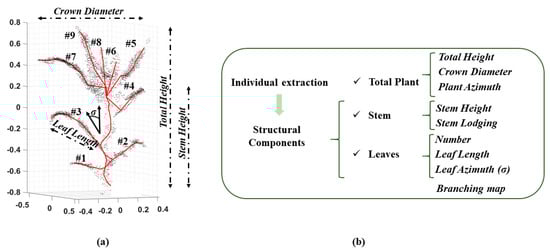 The curve-skeleton is a structure that extracts the volume and topological characteristics of each individual plant represented by a point cloud and 3D line. In that way, we can easily define individual plant traits and different structural components of the plant: stem and leaves. As an individual plant phenotypic trait, we extracted the total height (difference between zmaximum and zminimum), crown diameter (difference between xmaximum and xminimum) and plant azimuth. The azimuth angle is defined as the angle between the maximum eigenvector of the plant skeleton and the north direction on the vertical projection plane. The origin of coordinate axes was selected as the leftmost point of the plant skeleton, with a value between 0 and 180°. The stem was defined as the most vertical line. The leaves originate from stem bifurcations and have a dead-end as a topological rule. In addition, leaves must have a minimum length to be considered a proper leaf. The stem lodging was calculated by computing the orientation between medium points from the beginning and end stretch (defined by a minimum distance) of the stem skeleton; from each leaf, we mathematically computed the length based on the length of the skeleton defined as leaf and the azimuth. The leaf azimuth is defined as the angle between the maximum eigenvector of a leaf skeleton and the north direction on the vertical projection plane. The origin of the coordinate axes was selected as the connection node between the proper leaf and the stem. The value of leaf azimuth is between 0 and 360° [34]. Figure 5 shows how the traits were extracted from the skeleton.