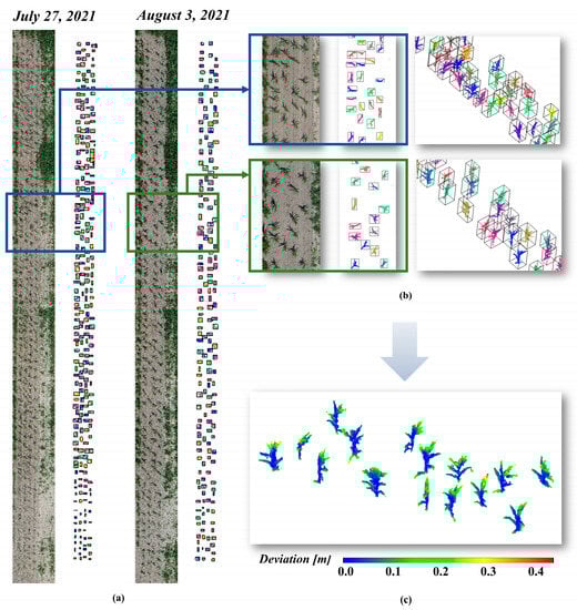 Point clouds from the two dates and individual plant extraction in different colors surrounded by a bounding box (a); zoomed window of a random area with a 3D view of the extracted plants (b); plant growth within this zoomed area from the two dates quantified in meters (c).