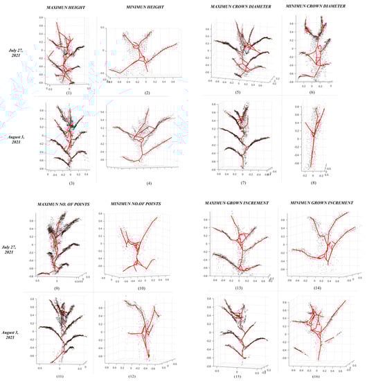 The 3D skeleton extraction in red overlapped the individual point cloud in black of 16 plant samples: maximum and minimum height, crown diameter, number of points and grown increment from the two flights (27 July 2011 and 3 August 2011).